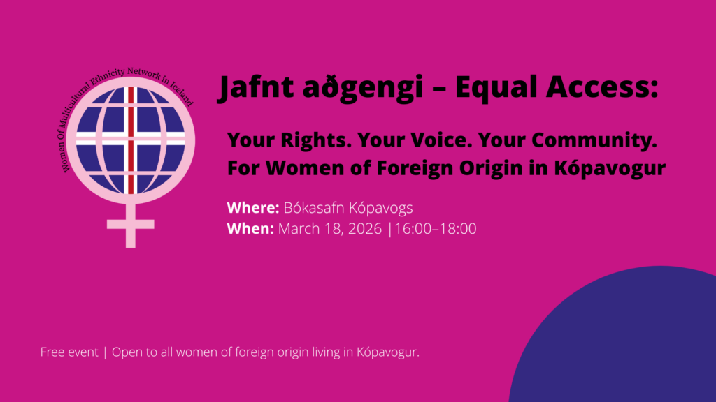Your Rights. Your Voice. Your Community.For Women of Foreign Origin in Kópavogur Free event | Open to all women of foreign origin living in Kópavogur Women of foreign origin make up an important and vibrant part of Kópavogur’s community. At the same time, many face barriers such as language challenges, limited access to information, social […]