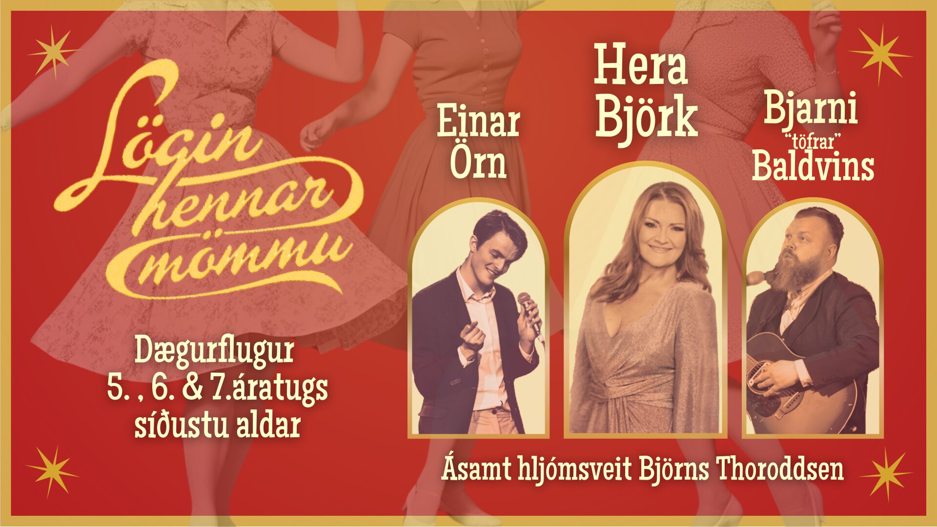 Söngvararnir Hera Björk, Einar Örn og Bjarni “Töfrar” Baldvins leiða hér saman hesta sína og flytja lögin sem að mömmur & ömmur rauluðu við heimilistörfin á 5.,6. og 7.áratug síðustu aldar. Þau syngja lögin, segja sögurnar og rifja upp alla gömlu góðu hittarana á borð við Heyr mitt ljúfasta, Björt mey, Lóa litla, Fjórir kátir, Halló, Þrek og tár, Bjössi á Mjólkur, Vegir liggja, Vertu ekki að horfa ofl. ofl. ofl.! Og þetta gera þau undir dillandi hljóðfæraleik hljómsveitar meistara Björns Thoroddsen, en hana skipa auk gítarmeistara Björns, Matti Kallio á píanó, Sigfús Óttarsson á Trommur og Jón Rafnsson á bassa.
